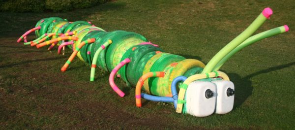 타이어는 여러 가지 색깔로 칠해져 있습니다. 마치 애벌레 몸통처럼 하나씩 나란히 놓여 있습니다. 하나는 앞쪽에 세로로 놓여 있고, 이 타이어에는 눈이 그려져 있습니다. 가로 타이어에는 꽃이 낮게 심어져 있습니다.
