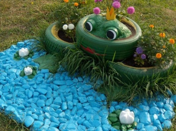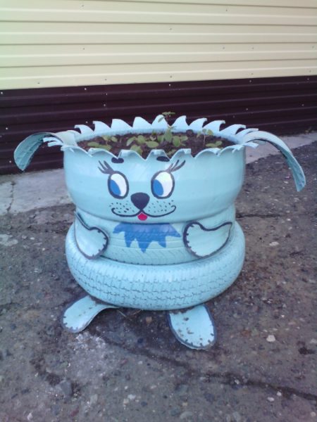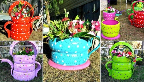 타이어를 뒤집어 아름다운 화분을 만들 수 있습니다. 타이어 한쪽 면을 가장자리를 따라 아름답게 다듬습니다. 고무를 뒤집어 더 작고 더 큰 조각으로 만듭니다. 작은 조각은 와인잔처럼 줄기를 만들고, 더 큰 조각은 식물을 담는 용기로 사용합니다. 화분은 아름답게 장식할 수 있습니다. 유화로 그린 간단한 그림도 좋고, 거울이나 세라믹 모자이크처럼 흥미로운 디테일을 더할 수도 있습니다. 내부 스티커를 사용할 수도 있지만, 사용 후에는 니스칠을 해야 합니다.