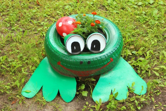 타이어 세 개로 만들었어요. 아래에 두 개, 위에 하나. 위에 있는 타이어는 머리 모양으로 만들고, 눈은 붙이고 입은 그렸어요. 아래에 있는 타이어에는 꽃을 심었어요. 발은 낡은 지느러미로 만들 수 있어요.