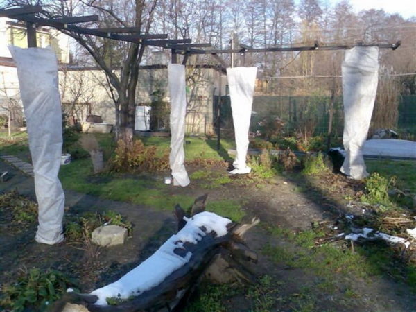 - 설치류. 덮개는 생쥐, 산토끼, 토끼가 나무껍질에 닿지 못하게 막아줍니다. 이렇게 하면 나무가 손상되는 것을 방지하고 서리를 잘 견뎌낼 수 있습니다.