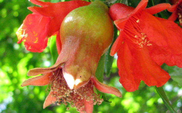 석류나무는 이란이 원산지로, 자연 서식지는 건조한 사막 기후입니다. 개화 시기는 비교할 수 없을 만큼 아름다운 풍경을 선사합니다. 먼저 연한 노란색부터 선명한 에메랄드색까지 다채로운 색상의 잎이 풍성하게 자랍니다. 며칠 후, 새싹이 돋아납니다. 이 과정은 초여름부터 초가을까지 이어집니다. 이 과정은 끊임없이 이어지기 때문에, 하나의 가지에 익고 자라는 열매, 새싹, 그리고 아직 열리지 않은 새싹이 동시에 맺힐 수 있습니다.