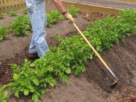 포복경이 꽃을 피우기 전에 모든 덤불을 흙으로 덮어야 합니다. 꽃이 피는 동안 덩이줄기가 형성되기 시작합니다. 따라서 이 단계에서 감자를 덩이줄기로 덮는 것을 피할 수 있다면 하지 않는 것이 가장 좋습니다. 만약 이 과정을 피할 수 없다면 매우 신중하게 해야 합니다. 부주의한 작업은 자라나는 덩이줄기를 손상시키고 향후 수확을 망칠 수 있습니다.