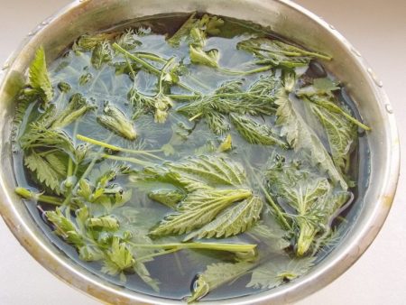 감자 잎을 우려낸 요리. 수거된 감자 모종 잔여물(600~700g)을 잘게 부순 후 물통에 담아 2~3일 동안 우려냅니다. 우려낸 물을 걸러낸 후, 비누가루를 넣고 모종에 혼합물을 뿌립니다.