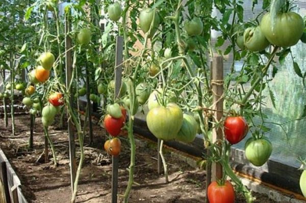 온실에서 키가 크거나 중간 크기의 토마토를 가지치기하려면 표준적인 두 줄기 재배 기법을 사용합니다. 첫 번째 옆가지 가지치기에서는 두 번째 줄기를 형성하는 하나를 제외한 모든 옆가지를 제거합니다. 잠시 후, 덤불이 원하는 높이에 도달하면 윗부분을 솎아냅니다.