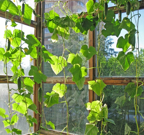 실내 오이를 묶는 전통적인 방법 외에도 흥미로운 장식용 묶기 기법을 살펴보세요. 사진은 독특한 덩굴 배열을 보여주는데, 이들을 조합하면 창틀을 장식하기에 완벽한 장식적 구성이 완성됩니다.