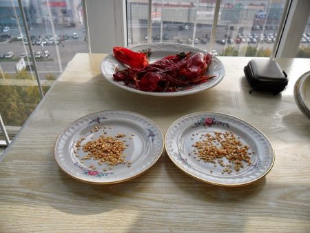 고추 씨앗을 수확하는 것은 단고추 씨앗을 수확하는 것과 크게 다르지 않습니다. 하지만 고추 씨앗을 다룰 때는 마스크나 방독면을 착용하고, 얼굴을 만지지 않도록 하며, 취급 후에는 손을 깨끗이 두 번 씻는 것이 필수적입니다. 이러한 지침을 따르지 않으면 피부 작열감이나 화상을 포함한 매우 불쾌한 결과를 초래할 수 있습니다.