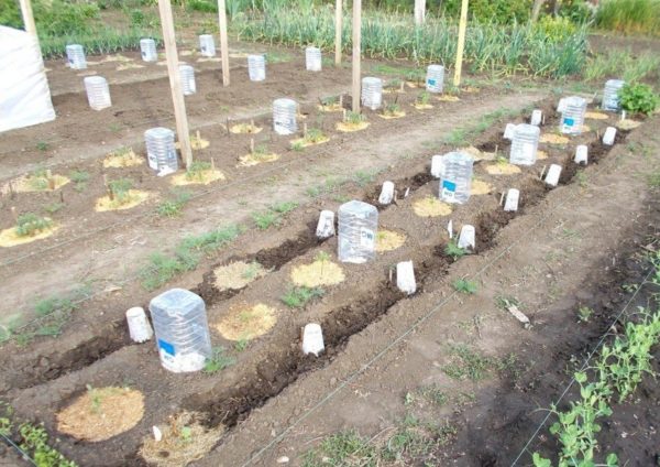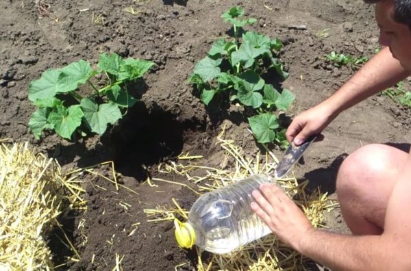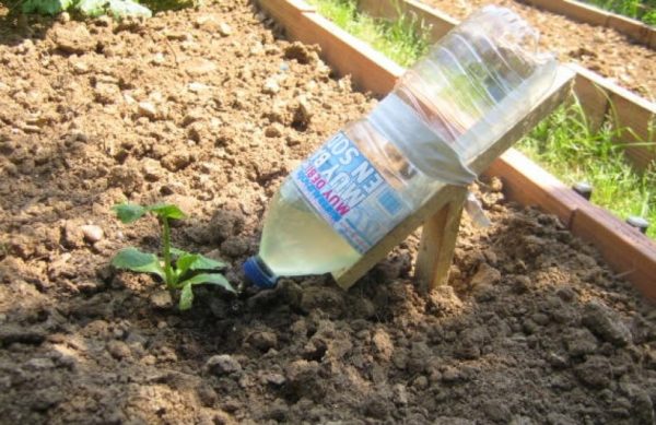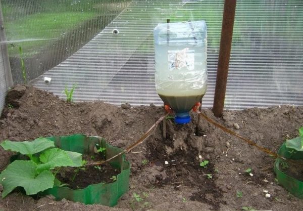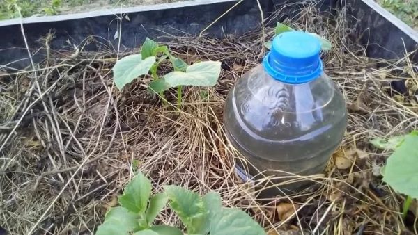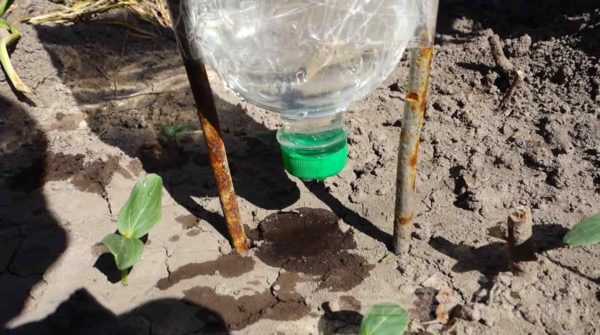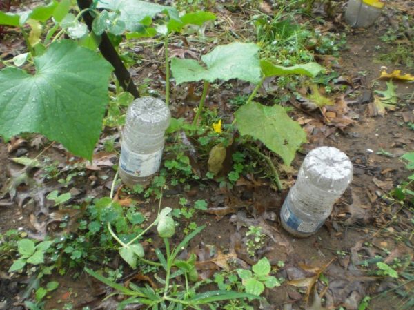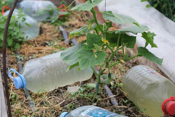 오이를 심은 정원 침대의 경우, 병을 옆으로 땅에 묻고 목을 위나 아래로 하여 점적 관개 시스템을 만드는 것이 더 편리합니다.