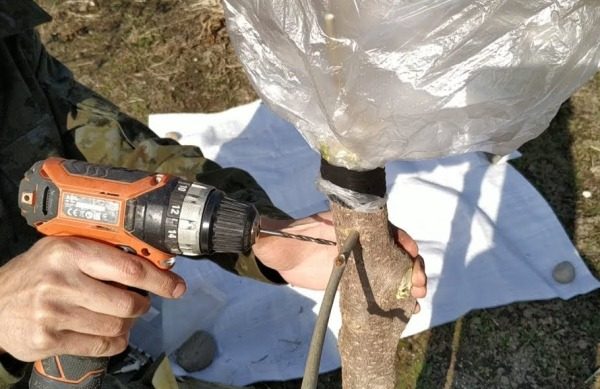 - 나무의 건강을 회복하려면 다른 방법을 권장합니다. 줄기를 원하는 높이까지 잘라내고, 설명한 대로 드릴 비트를 선택한 후 스톱을 부착합니다. 접수 끝부분을 4~5cm 깊이로 다듬습니다. 자른 부분과 사용한 도구는 과망간산칼륨으로 소독할 수 있습니다. 여러 개의 구멍을 한 번에 뚫고 접수를 박은 후 정원용 퇴비를 뿌립니다. 새순이 수직으로 자라기 때문에 접촉 면적이 훨씬 넓어 생존율이 높아집니다. 이 방법은 최소한의 노동력만 필요합니다.