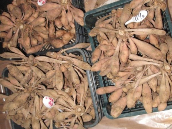 먼저, 덩이줄기를 준비해야 합니다. 덩이줄기를 씻어서 말려야 합니다. 그런 다음 점토 용액을 준비합니다. 용액은 진한 사워크림 정도의 농도여야 합니다. 그런 다음 각 덩이줄기를 이 용액에 담그고 말립니다. 뿌리는 특별히 준비된 용기에 담그는 것이 가장 좋습니다. 덩이줄기를 심을 때는 점토 껍질을 조심스럽게 제거해야 합니다.