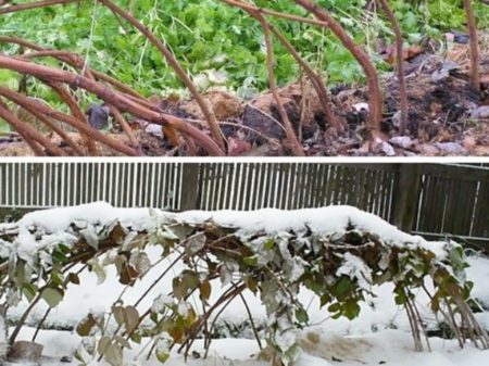 잎을 제거한 후 가지를 아래로 구부립니다. 1kg 돌멩이를 가지 묶음에 묶어 땅에 놓습니다. 상록성 품종지지대 위에 자라는 라즈베리 줄기는 아래 가로대에 간단히 고정하여, 최종 송이 높이가 25cm를 넘지 않도록 합니다. 이렇게 하면 분리된 라즈베리 줄기가 눈선 위로 자라 얼어붙는 것을 방지할 수 있습니다. 또한, 구부러진 라즈베리 줄기를 스판덱스로 덮을 수도 있습니다. 이렇게 하면 식물이 숨을 쉬고 눈이 부족할 경우 추위로부터 보호할 수 있습니다.