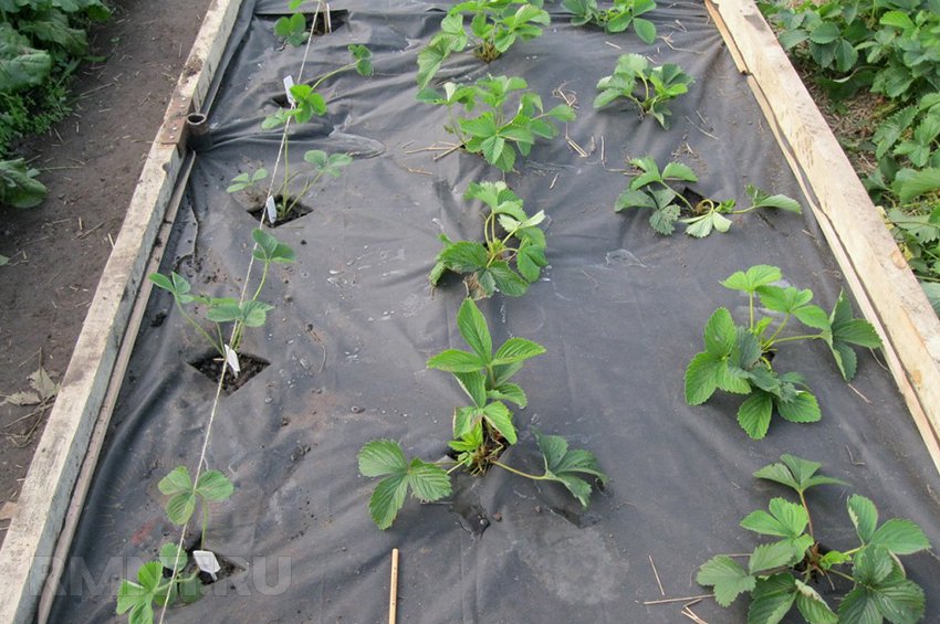 둘째, 딸기를 모두 60g/m2 두께의 검은색 아그로스판 멀치에 조금씩 옮겨 심었습니다. 이 멀치는 최소 5년 동안 유지됩니다. 더운 날씨에도 아래 토양이 과열되지 않았고, 러너 제거가 쉽고, 딸기가 깨끗하며, 잡초가 없고, 물 주는 횟수가 줄어드는 등 여러 가지 장점이 있습니다.