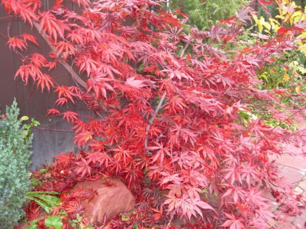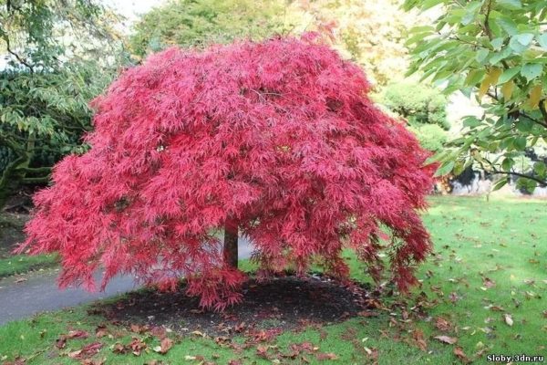 손바닥단풍나무(또는 부채단풍나무)는 느리게 자랍니다. 키가 4~6m에 달하는 작은 관목입니다. 수관은 둥글고 넓어 우산 모양을 하고 있습니다. 어린 가지는 자홍색 또는 녹색을 띱니다. 잎은 갈라지고 우아합니다. 다 자란 단풍나무의 잎은 밝은 붉은색입니다. 야생에서는 중국, 한국, 일본에서 자랍니다.