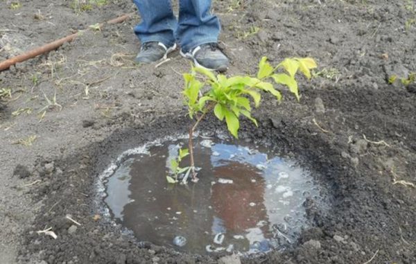 - 뿌리를 약 10cm 두께로 덮고 흙을 평평하게 한 후, 따뜻한 물이나 침전된 물을 3통 정도 구덩이에 붓습니다. 구덩이를 지면 높이까지 채우고 표면을 잘 다져줍니다. 물을 너무 많이 주지 마세요.