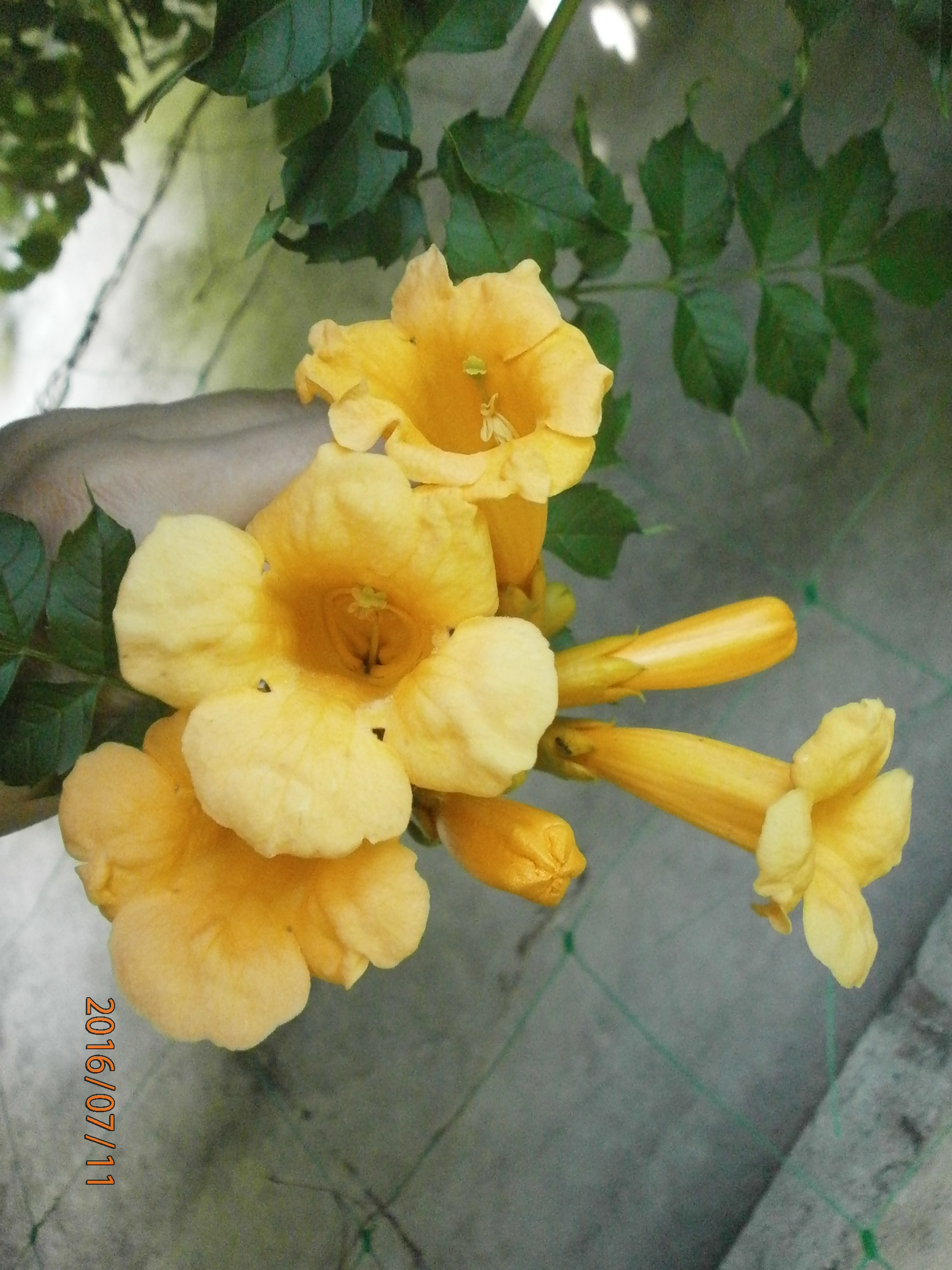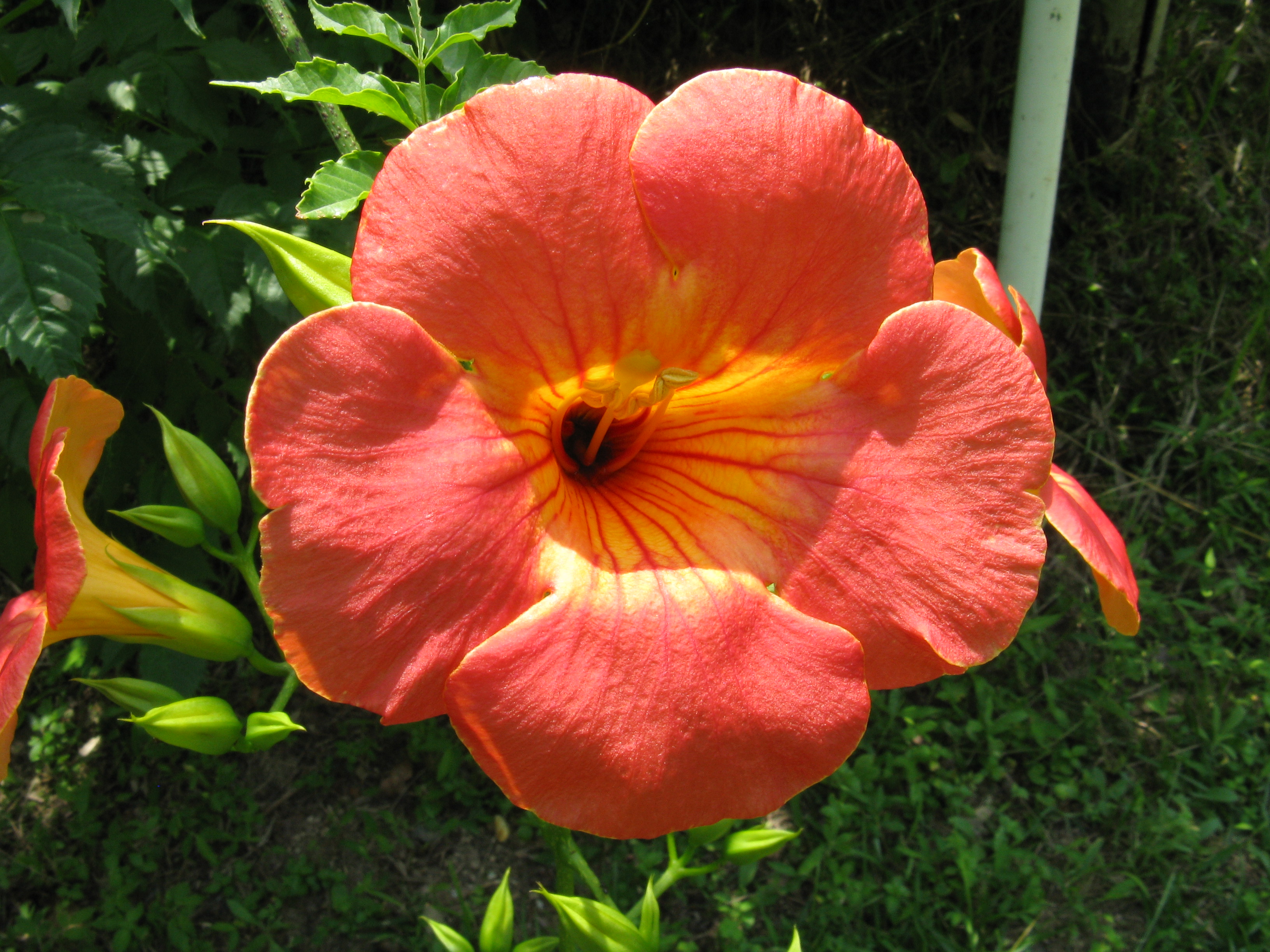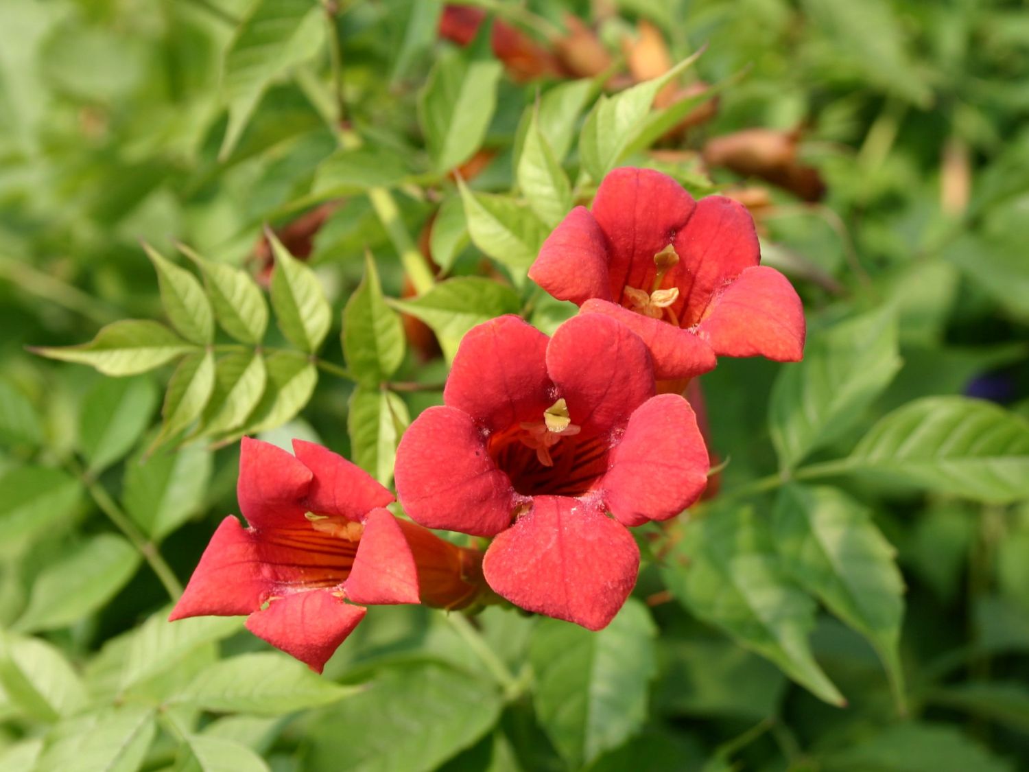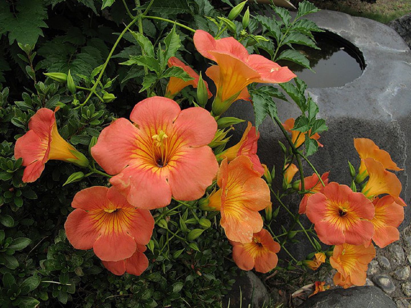 중국산 대형 꽃 품종은 기근이 없는 덩굴성으로 분류됩니다. 싹을 통해 지지대와 표면에 붙어 자라기 때문에 덩굴성으로 분류됩니다. 잎자루에는 최대 길이 6cm의 7~8쌍의 잎이 달리고, 잎자루에는 털이 빽빽하게 나 있습니다. 꽃은 길이 8cm를 넘지 않는 좁은 관 모양이며, 주황색입니다. 뿌리가 있는 품종에 비해 싹이 작습니다. 영하 18도까지의 단기적인 기온 강하에도 잘 견디지만, 따뜻한 월동 환경을 선호합니다.