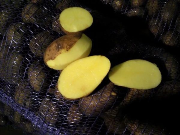 각 덩이줄기는 작고 타원형입니다. 무게는 84~135g입니다. 숙련된 재배자들은 한 구멍에 심은 모든 덩이줄기의 크기가 같다는 것을 알고 있습니다. 표면은 약간 거칠고 노란색을 띠며, 과육 자체는 짙은 노란색입니다.