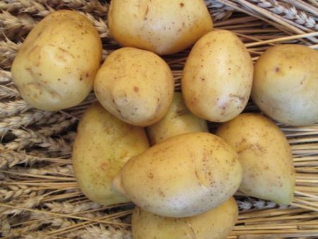 열매: 덩이줄기는 중간 크기로, 덩이줄기 하나당 무게가 약 100~150g입니다. 타원형 또는 둥글며 껍질과 중앙은 노란색을 띱니다. 작은 눈은 표면에 가깝게 있습니다. 어린 감자는 껍질을 벗기기 쉬운데, 이 또한 장점입니다. 껍질을 벗긴 후에도 껍질이 어두워지지 않습니다.