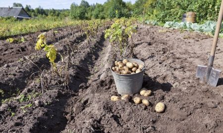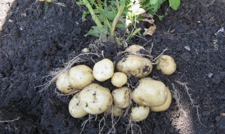 - 녹색 꼭대기가 오랫동안 죽어서 감자 괴경이 거의 여름 내내 자라서 큰 크기에 도달합니다.