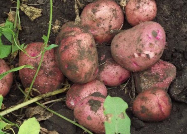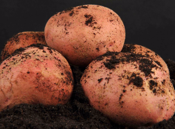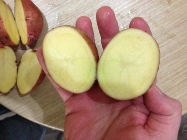 감자를 수확할 때, 한 그루에 크거나 중간 크기의 덩이줄기가 15~20개 정도 들어있을 수 있습니다. 덩이줄기는 겉은 둥글거나 약간 길쭉하며, 분홍색에서 붉은색까지 다양한 색상을 띱니다. 껍질은 촘촘하고 중간 두께입니다. 표면은 종종 울퉁불퉁하거나 매끄럽고, 미세한 그물망 무늬와 균일한 간격으로 배열된 눈을 가지고 있습니다. 감자의 속은 연한 노란색이어서 으깨지지 않고 잘 익습니다. 이는 감자의 전분 함량이 높아서 한 덩이줄기에는 20% 이상까지 달할 수 있기 때문입니다.