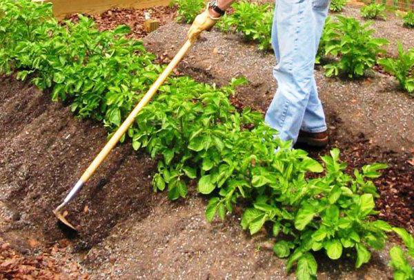 주라빈카 감자는 새싹이 15cm 정도 자라면 흙더미를 쌓는 것이 좋습니다. 괭이를 사용하여 감자 위에 흙을 펴서 흙더미를 만듭니다. 흙더미를 쌓는 동안 덤불 주변의 잡초를 제거합니다.