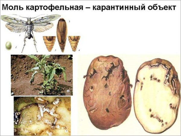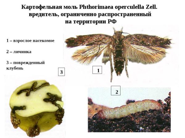 조기 숙성 감자 품종은 해충에 가장 취약하며, 소규모 재배 농가에서는 이 점을 효과적으로 활용합니다. 상업적 재배에서는 중생 품종에 살충제를 처리하는데, 다나딤(Danadim), 비-58(Bi-58), 디톡스(Ditox), 디-68(Di-68), 로고스-S(Rogos-S)가 가장 효과적인 것으로 간주됩니다. 용기를 포함한 창고는 소독하고, 낮은 온도와 습도를 유지하여 나방의 발생 주기를 150일로 단축합니다.