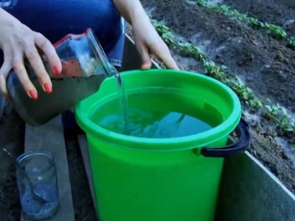 - 황산구리를 용액이 담긴 양동이에 붓고, 저은 후 액체를 더해 10리터를 만듭니다.