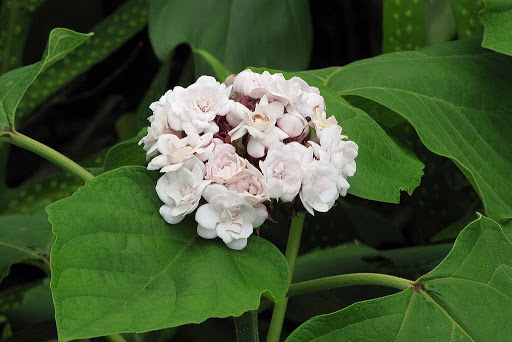 이 덩굴식물은 실내에서 거의 키우지 않습니다. 남부 지역에서는 울타리로 사용합니다. 이 클레로덴드룸 종은 흰색 꽃과 밝은 보라색 수술을 가지고 있습니다. 라임빛 녹색 잎은 대리석 무늬를 가지고 있습니다.