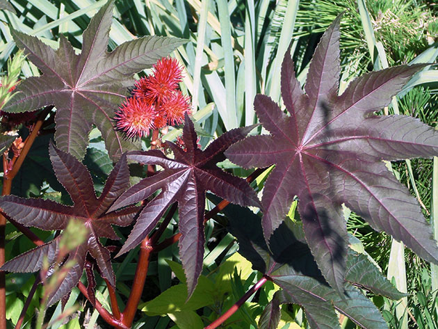 코키아와 같은 식물과 함께 피마자유 식물을 화단에 심으면 잘 어울립니다.