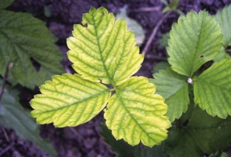 이 질병은 특정 원소의 결핍으로 인해 발생합니다. 식물에 정확히 어떤 영양소가 부족한지는 겉모습을 보면 알 수 있습니다. 철분 결핍증이 발생하면 잎은 희끄무레하거나 노랗게 변하지만, 잎맥은 본래 색을 유지합니다. 이 경우, 가을에 황산제일철을 관수해야 합니다.