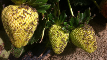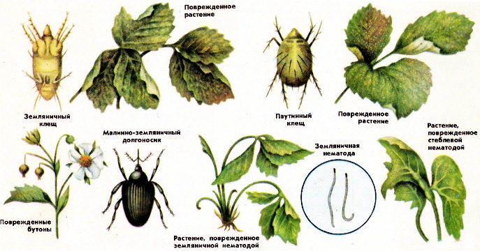 딸기 응애는 길이가 0.2mm에 불과하고 반투명한 몸통에 황색 또는 갈색을 띠기 때문에 식물에서 발견하기가 사실상 불가능합니다. 이 진드기에 감염되면 수목이 왜소해집니다. 딸기 응애를 방제하려면 0.3% 카르보포스 용액을 사용하십시오. 용액을 만들려면 카르보포스 30g을 물 10리터에 녹입니다.