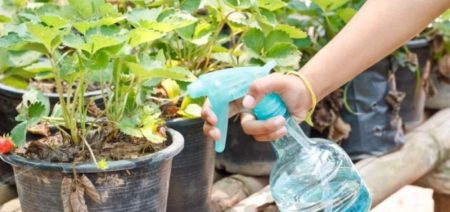 흰파리를 퇴치하려면 "악타라" 용액을 사용하세요. 먼저, 25°C로 데운 물 1리터에 "악타라" 용액 4g을 녹입니다. 그런 다음, 농축액 250g을 배낭 분무기 탱크에 붓고 용기를 1/4 정도 물로 채웁니다. 용액을 완전히 섞은 후 가을에 딸기에 살포합니다.