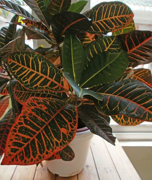 - 크로톤 '미세스 아이스턴'. 잎은 빽빽하게 자라며 줄기 전체를 따라 가로로 배열되어 있습니다. 어린 잎은 연한 연두색이고, 다 자란 잎은 갈색, 적갈색, 노란색, 짙은 녹색 등 다양한 색을 띱니다. 줄무늬는 매끄럽게 이어져 마치 수채화로 그린 듯합니다.