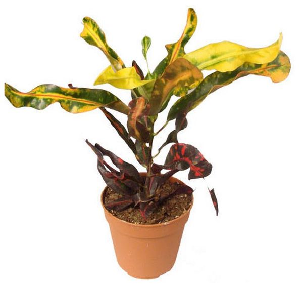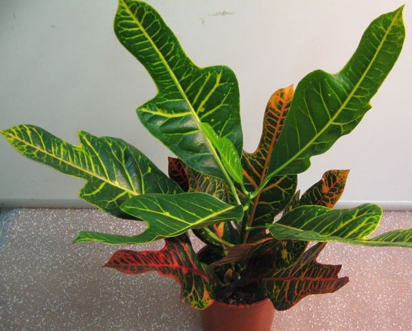 - 크로톤 '잔지바르'. 좁고 피침형의 곡선형 잎을 가진 희귀 품종입니다. 녹색, 노란색, 버건디색, 보라색 등 다양한 색조가 어우러져 있으며, 중앙 잎맥은 붉은색입니다. 조명이 밝을 때 아름다움이 극대화됩니다.