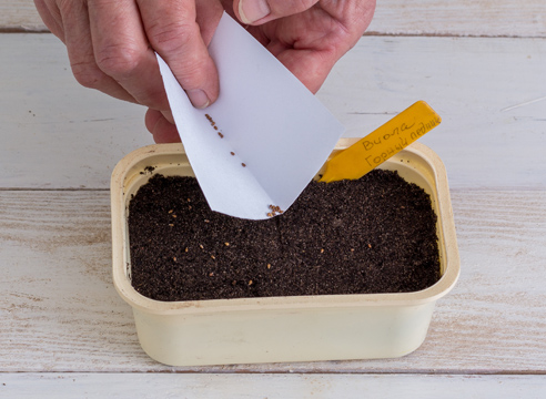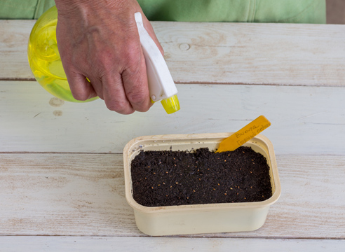 - 완전히 담그세요. 흙 용기에 약 5mm 깊이의 고랑을 파고 씨앗을 넣은 후 흙으로 덮으세요. 다음으로, 발아할 때까지 따뜻한 곳에 씨앗을 두세요.