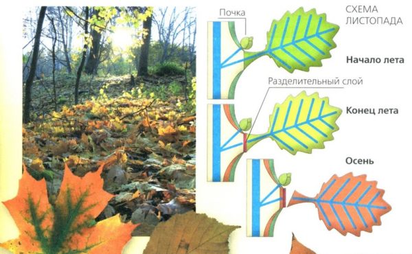 여름에는 잎이 돋아난 가지에 단단히 붙어 있습니다. 하지만 점차 가지와 잎자루 밑부분 사이에 코르크 같은 층이 형성됩니다. 바로 이 지점에서 잎이 분리됩니다. 이러한 이유로 여름보다 가을에 가지에서 잎을 제거하는 것이 훨씬 쉽습니다.
