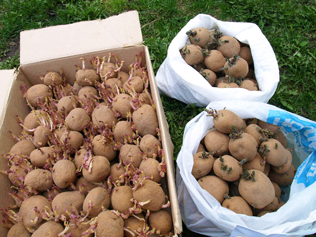 - 발아. 예상 심기일 2~3주 전에 덩이줄기를 따뜻하고 밝은 방으로 옮깁니다. 덩이줄기가 약간 녹색으로 변하더라도 놀라지 마세요. 이는 솔라닌이 축적되었다는 것을 의미하며, 이는 병 발생을 예방합니다.