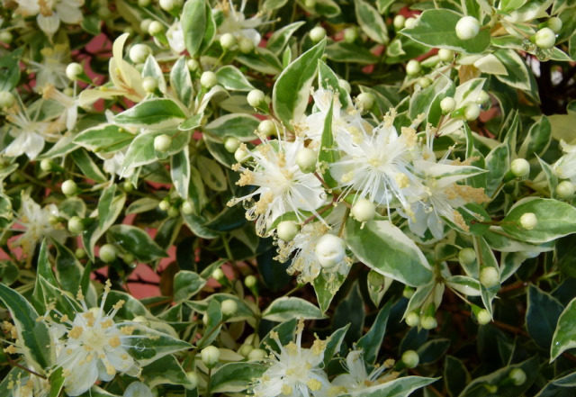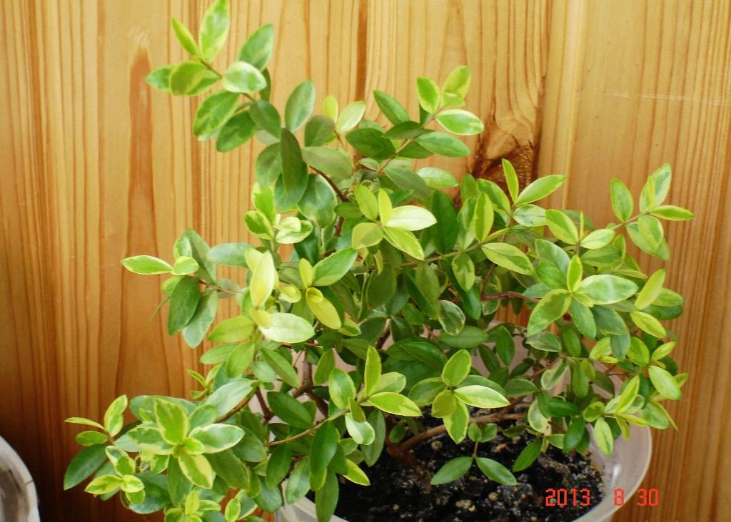 - 얼룩무늬 머틀은 가장자리에 줄무늬와 점이 있는 아름다운 얼룩무늬 잎을 만듭니다. 이 종은 선명한 색상을 유지하려면 충분한 빛이 필요합니다. 쾌적한 환경에서는 베이지색을 띤 촘촘한 흰색 꽃이 핍니다.