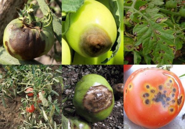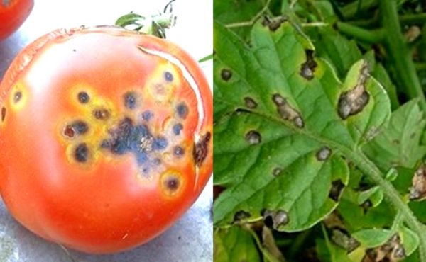 잎자루와 줄기에 뚜렷한 윤곽이 있는 고리 모양의 반점이 생기고, 벨벳 같은 회색 막으로 덮여 있습니다. 반점은 빠르게 자라 깊어집니다. 식물의 신진대사가 방해를 받아 수풀이 더 이상 자라지 않습니다. 토마토가 변형되었습니다, 맛이 떨어집니다. 과일의 경우, 병반은 줄기 근처에 집중되어 있으며, 움푹 패이고 물에 젖어 있으며, 병변 부위의 껍질은 창백합니다. 병반은 점차 커지고 갈색을 띤 검은색으로 변하며, 때로는 연한 회색 막이 생깁니다. 토마토는 익기 전에 떨어지거나, 반대로 너무 일찍 익기도 합니다.