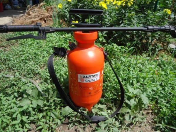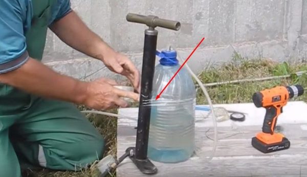 플라스틱 병에 니플을 끼울 구멍을 뚫고 벽에 단단히 고정합니다. 고무 씰을 접착제로 고정합니다. 펌프 호스를 니플에 나사로 고정합니다. 분무기를 병목에 부착합니다. 자전거 펌프를 플라스틱 용기의 닫힌 위치에 고정합니다. 시스템을 작동하려면 자전거 펌프로 병에 압력을 가합니다. 펌프를 작업 영역 쪽으로 향하게 하고 분무기 밸브를 엽니다.