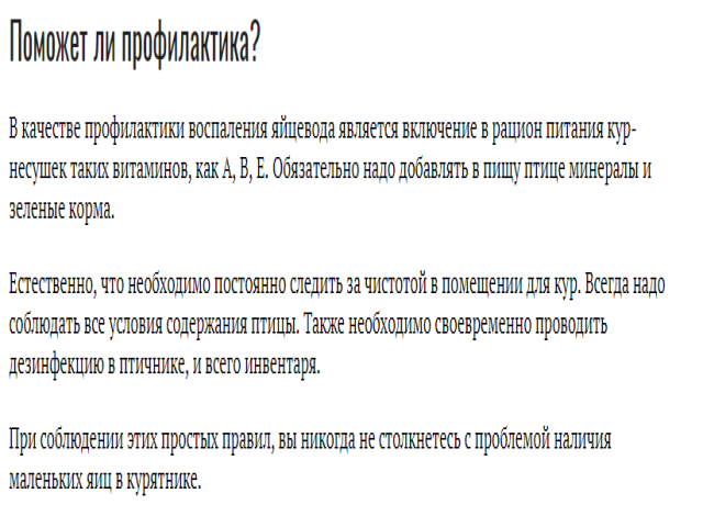 - 난관염. 다 자란 암탉이 작은 알을 낳기 시작하면 문제가 있는 것입니다. 또한, 난관 염증은 알의 질과 크기를 감소시킵니다.