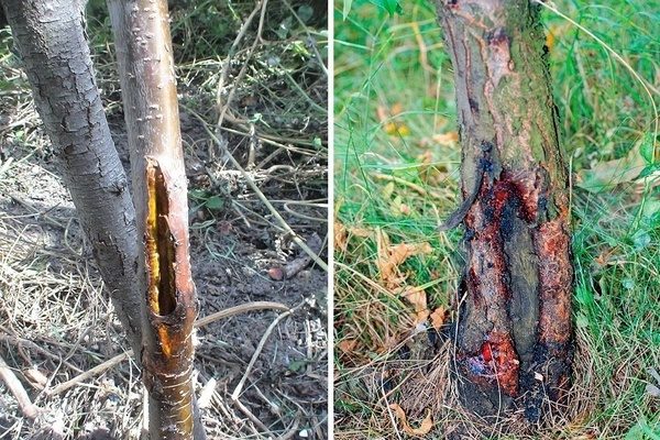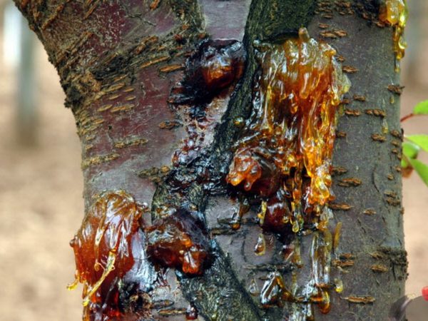 - 고무증. 균열 부위에서 다량의 고무가 방출됩니다. 시간이 지남에 따라 가지가 마르기 시작하고, 그다음 줄기가 마르게 됩니다.