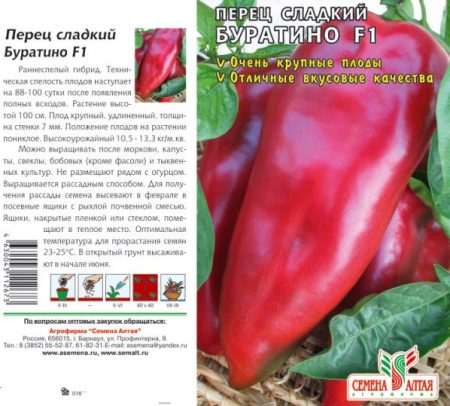 - '부라티노'는 12~15cm 길이의 길쭉한 열매를 맺는 고추 품종입니다. 0.7~1m 높이의 덤불에서 80~120g 무게의 원뿔형 고추가 열립니다. 아름다운 외관, 긴 저장성, 그리고 장거리 운송이 용이하여 인기가 높습니다. 익은 고추의 껍질 두께는 4~5mm입니다.