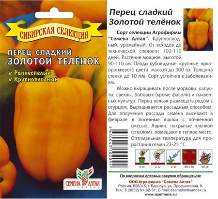 - "황금 송아지" 고추는 100~110일이면 수확할 수 있고, 무게는 300g으로 조기에 수확할 수 있어 매우 맛있습니다. 고추의 벽 두께는 10mm입니다. 높이는 0.9~1.1m로 자라면서 지지대가 필요합니다. 채소는 밝은 주황색이며, 열매는 정육면체 모양입니다.
