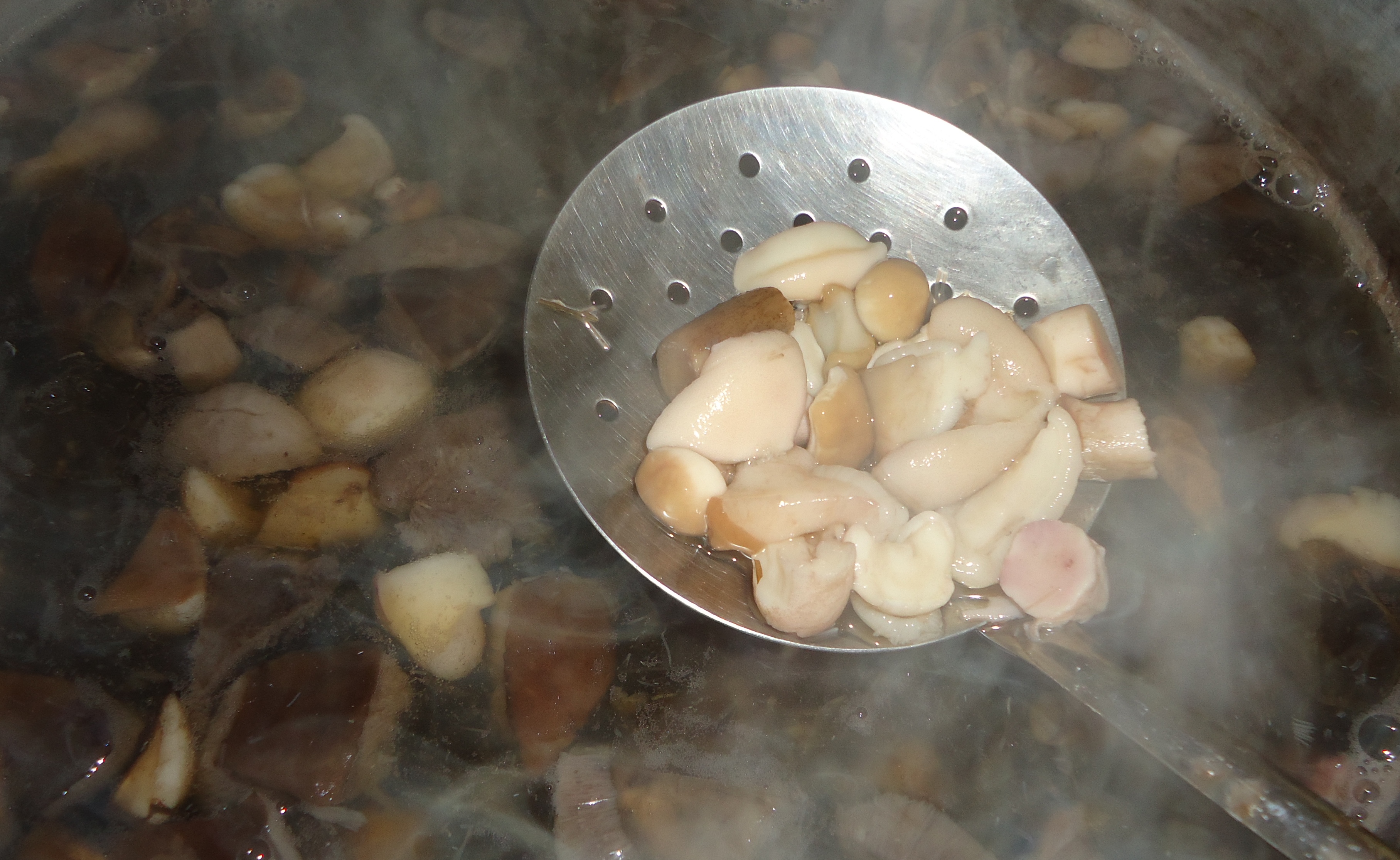 버섯을 선별한 후 끓는 물에 중불로 15~20분간 끓입니다. 숙련된 요리사들은 버섯의 풍미를 더하기 위해 껍질을 벗긴 양파를 통째로 넣을 것을 권장합니다. 끓인 후, 버섯의 물기를 빼고 절임 과정을 시작합니다.