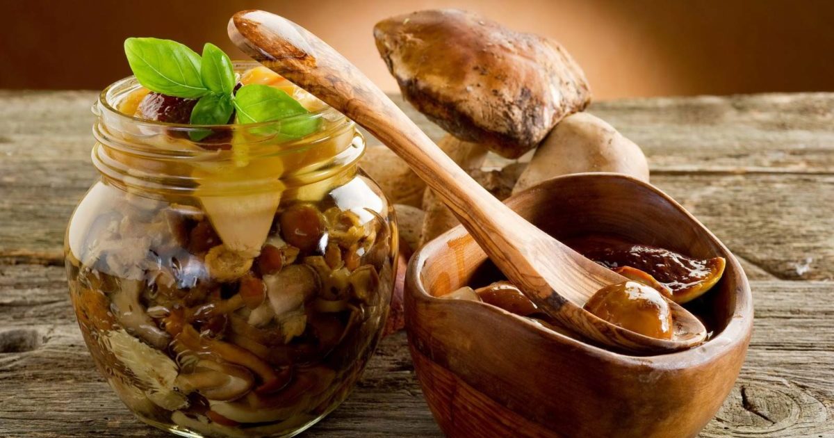 그 후 불을 줄이고 적포도주 식초 몇 큰술, 흑설탕 20g, 그리고 소금을 넣어 간을 합니다. 몇 분 안에 모든 재료가 익습니다. 병에 담아 버섯 볶음액을 붓고 냉장 보관합니다.