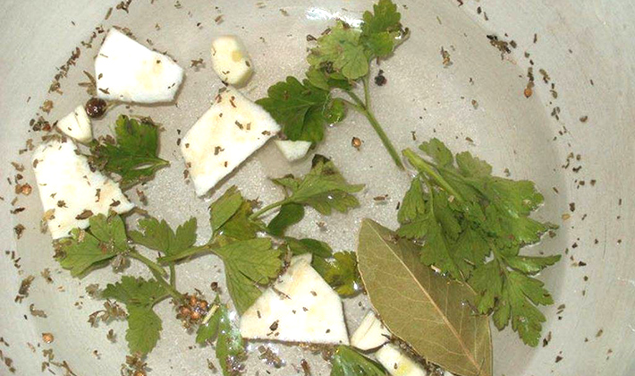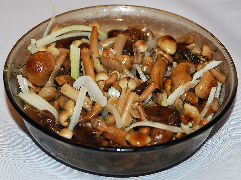 - 준비된 꿀버섯을 용기에 층층이 쌓아 놓고, 각 층에 소금, 향신료, 양 고추냉이, 마늘을 뿌립니다.