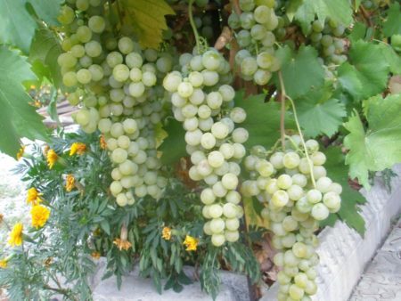 리바디아 포도는 생산성이 매우 높습니다. 한 송이의 무게는 500~800g이며 길쭉한 원뿔 모양을 하고 있습니다. 포도는 작고 타원형이며, 연한 녹색을 띠고 호박색을 띠며 은은한 흰색 꽃이 피어납니다.