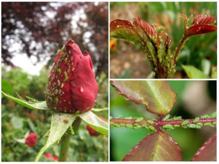 녹색 진딧물은 5월 말에서 6월 초에 장미에 나타납니다. 몸은 둥글고 길이는 1~2mm를 넘지 않습니다. 키틴질 외피는 연녹색이어서 발견하기가 매우 어렵습니다. 이 해충은 새싹과 어린 잎의 수액을 먹습니다. 수많은 진딧물 군집은 장미 식물을 완전히 시들게 합니다.