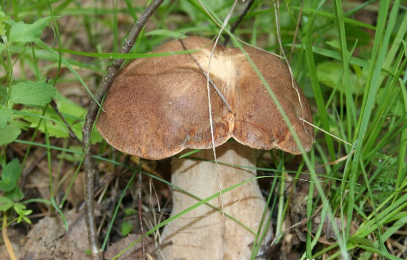 줄기는 두껍고 통 모양입니다. 자라면서 원통형으로 변하고, 밑부분이 두꺼워집니다. 줄기 색깔은 갓 색깔과 비슷할 수 있지만, 대부분 갓 색깔이 한두 단계 더 밝습니다. 거의 모든 품종은 줄기에 흰색 또는 미색을 띤 줄무늬가 있는 그물무늬를 가지고 있습니다. 이 그물무늬는 보통 줄기 윗부분에서 뚜렷하게 보입니다.