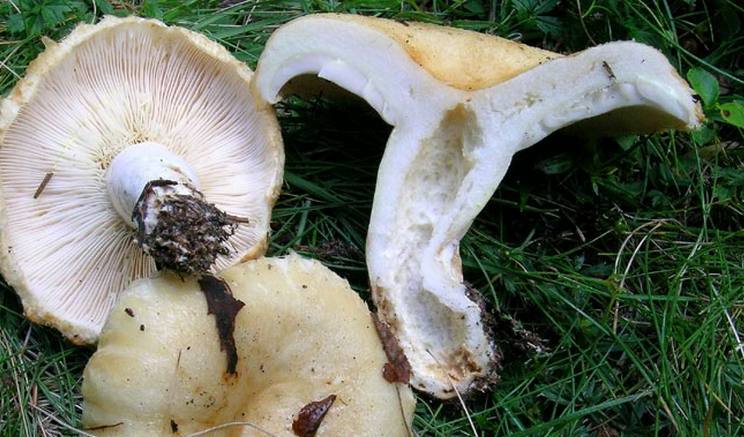 과육은 아니스 향이 나고 특유의 냄새는 없습니다. 섬유질이 많고, 특히 줄기 주변이 그렇습니다. 시간이 지남에 따라 과육은 즙이 줄어들고 매우 단단해집니다. 따라서 어린 버섯만이 요리에 귀중합니다. 아가미는 넓지만 드물게 나타납니다. 아가미는 흰색에 노란색 또는 회색빛을 띱니다. 포자 가루는 무색입니다.