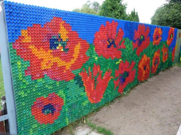 다음으로, 플라스틱 병을 여러 가지 색깔로 엮어 장식하세요. 이렇게 하면 흥미로운 무늬가 만들어집니다. 낡고 쓸모없는 판자가 있다면, 다시 마감하여 울타리로 사용할 수도 있습니다. 사포질한 피켓 울타리는 어린아이들이 좋아하는데, 상상력을 마음껏 발휘하여 꾸밀 수 있습니다.